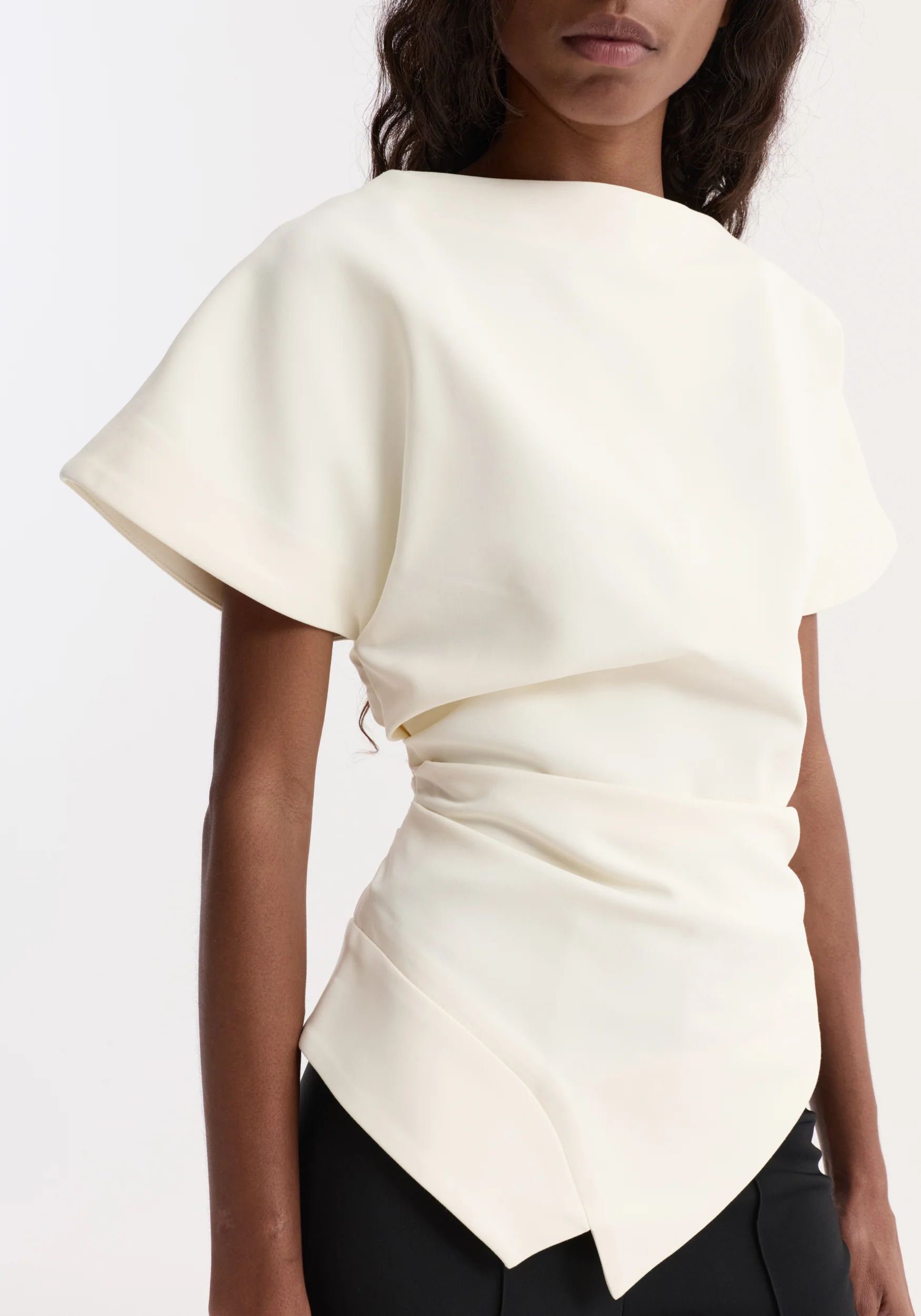 A directional piece with strong sartorial presence perfect for your modern dressing. The design features a slashed neckline, sculpted shoulder and deconstructed lapel to redefine tailoring with a soft architectural ease.