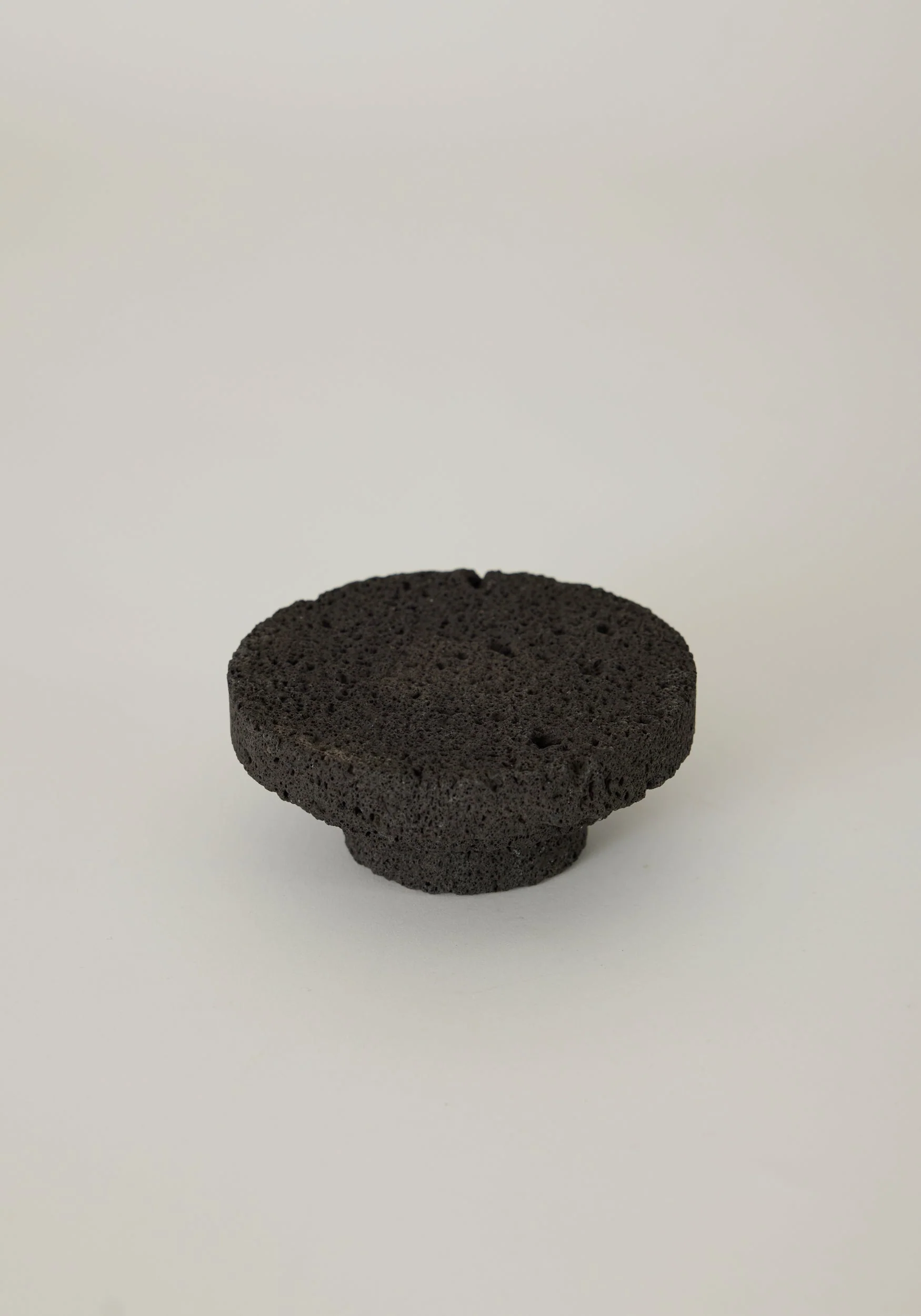 Small round tray on a sculptural platform, handcrafted in the Netherlands by Dutch artist Louis Crombag from left-over lava stone. The measurements are 6 cm H x 14 cm W. The material is 100% lava stone.