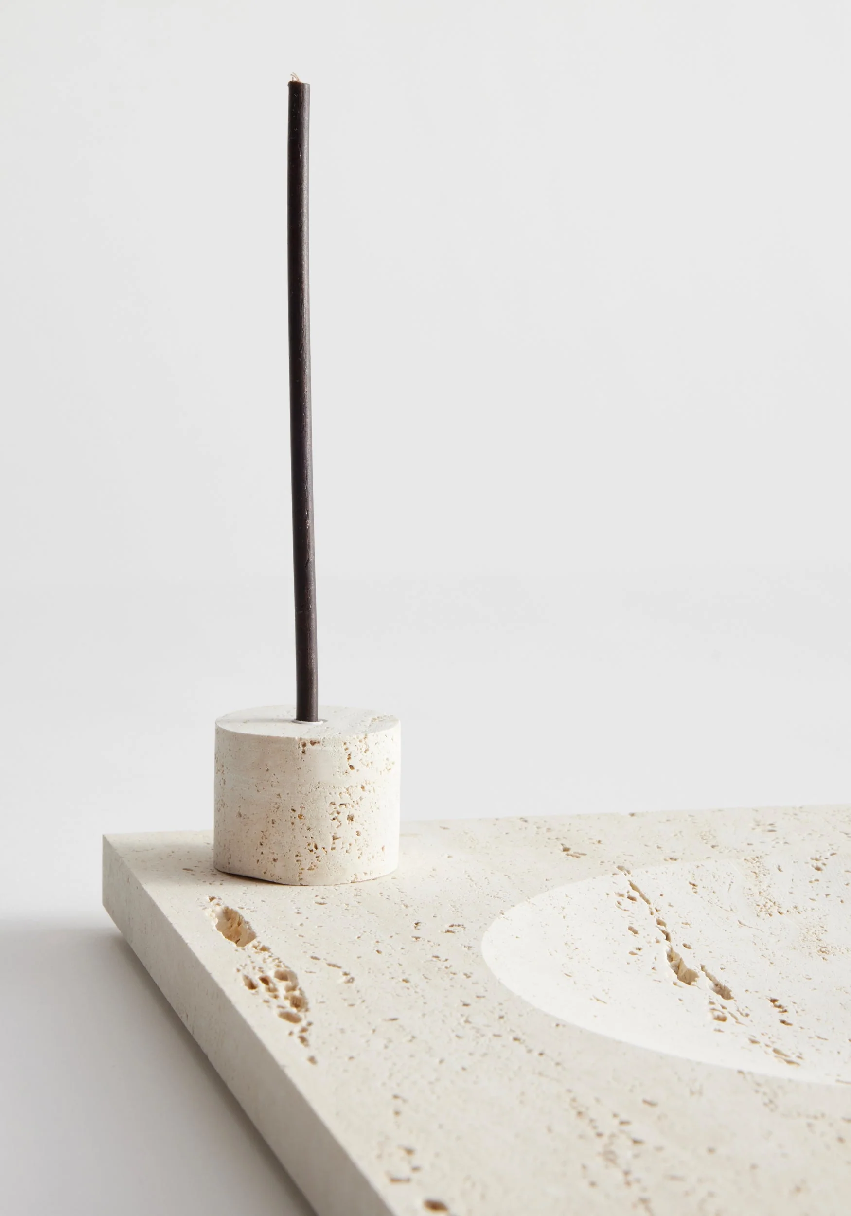 Large square tray with round carved indent, available in three different sizes, handcrafted in the Netherlands by Dutch artist Louis Crombag from left-over Italian travertine. Comes with a decorative travertine cylinder that fits a 5mm candle, and can be presented with or without a candle. The measurements are 30cm H x 30cm W x 2cm D. The material is 100% travertine.