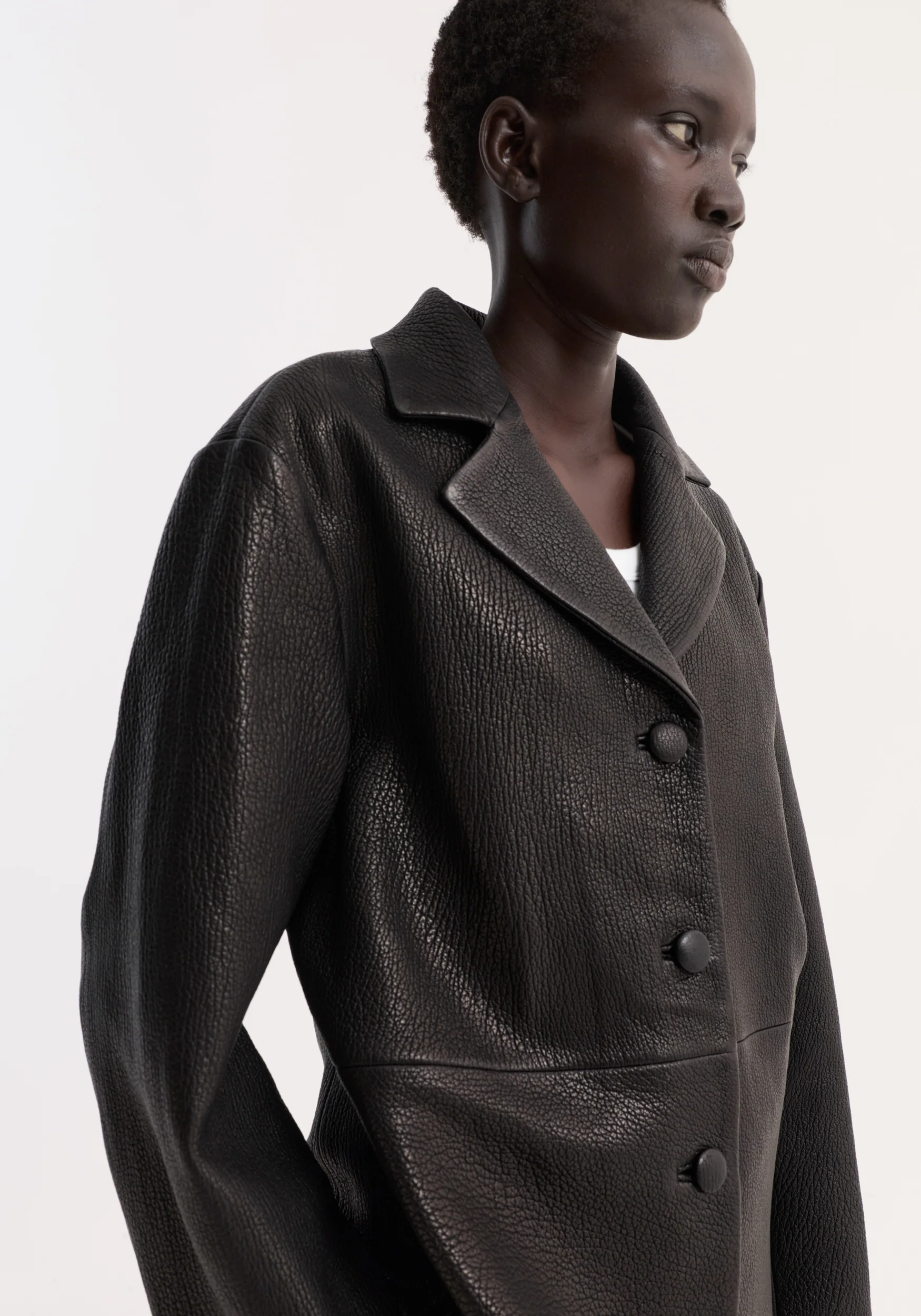 A structured jacket with a subtly boxy silhouette, crafted from rich, heavy-grain leather. Fully lined and single-breasted, it features leather button closures, side-seam pockets, and small side splits for ease of movement.